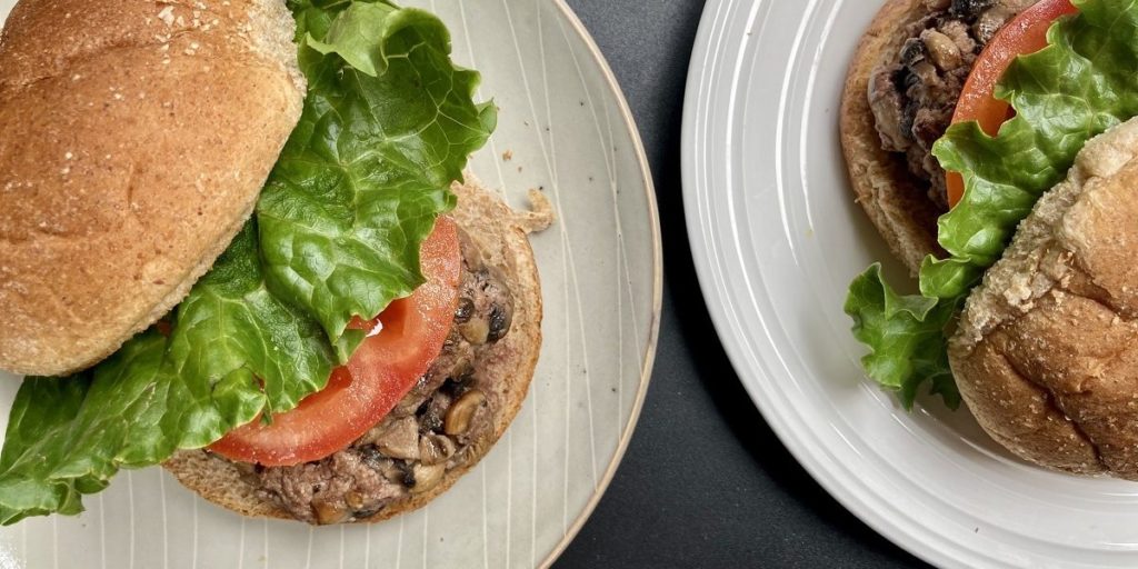 Mix together ground beef and cooked mushrooms. Salt to taste. Form into 4 patties and cook on a grill or skillet until internal temp reaches 165F degrees.