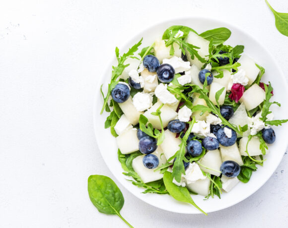 - In a large bowl toss together the spinach, torn basil, balsamic vinaigrette, blueberries, cantaloupe and feta cheese. Top with the pumpkin seeds and serve.