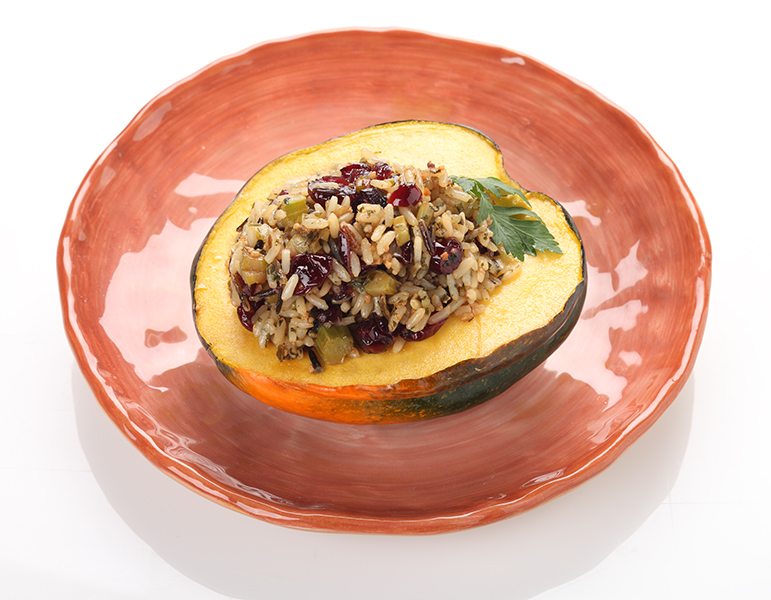 - Heat olive oil in a hot pan and sauté onions, celery and garlic until tender. Remove from pan and place in a large bowl; add the remaining ingredients: fresh thyme, dried cranberries, salt, black pepper, olive oil, balsamic vinegar, maple syrup, as well as the cooked wild rice. Mix to incorporate. Stuff into cooked acorn squash (each will hold about 1/2 cup of stuffing).