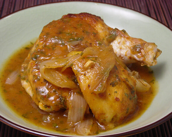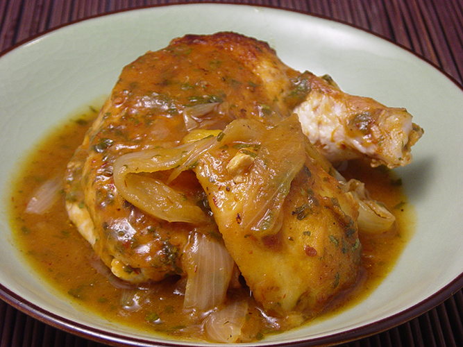 • Serve each piece of chicken with a half peach and 1/4 cup of sauce and onions.