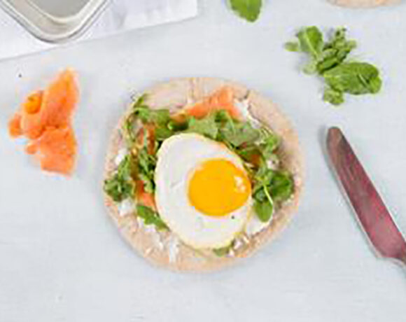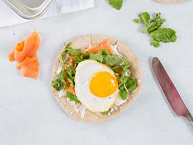 - Spread each pita with 1 tablespoons of the goat cheese. Divide the salmon 1 oz. for each and layer it on top. Divide the arugula and mound on 1/2 oz. on top of the salmon. Carefully place a fried egg on top of each pita.