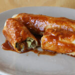 Mashed black beans with avocado wrapped with tortillas and baked with red chili sauce