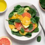Bright grapefruit and orange segments layered over baby spinach