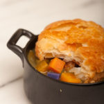 Defrost frozen puff pastry in the refrigerator (at least 2 hours to overnight). Place puff pastry on a floured worked surface and cut into 3-1/2 to 4” circles. Place on a parchment paper lined pan; return to refrigerator or freezer to chill. Preheat oven for 400F degrees and bake until golden brown and crispy, 15-20 minutes. Rotate pan half way for even cooking. Just prior to serving, add chopped cilantro to stew and stir to combine; place cooked pastry on top and serve.
