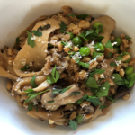Button mushrooms sautéed into a luscious umami farro risotto