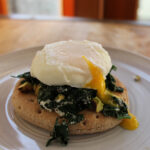 Simply blanched seasoned kale on top of toast with goat cheese, pistachios and poached egg.
