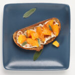 If possible, use artisanal whole wheat loaves, sliced to about 1 inch thick. Toast the bread. Spread 2 Tbsp of ricotta on the toast, sprinkle 1/8 Tbsp of cinnamon and finish with ¼ cup of peach compote. Sprinkle with sage.