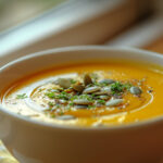 Savory soup with roasted butternut squash, garlic and onion