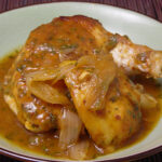 Serve each piece of chicken with a half peach and 1/4 cup of sauce and onions.